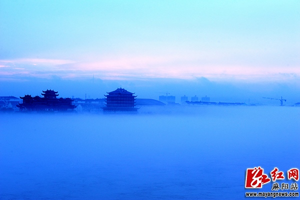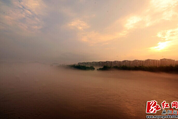 麻陽紅網(wǎng)攝影協(xié)會張杰拍攝 當天17時起,縣城段400多米寬的錦江河面上,云霧不斷從渾濁的河面升起,分別從錦江大橋的上下方各自飄移,每隔20來分鐘生成一次,到19時30分結(jié)束。這數(shù)百米長、白練狀的云霧,讓縣城風雨橋、水岸明珠、錦江閣、錦江新城等建筑如在海上仙境中。