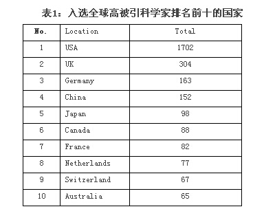 根據(jù)湯森路透(Thomson Reuters)近期公布的2014年全球高被引科學(xué)家名單,中國(guó)(含港澳)共有134人入選2014年“高被引科學(xué)家”,排名世界第四,僅次于美國(guó)(1702人)、英國(guó)(304人)和德國(guó)(163人)。此前,該機(jī)構(gòu)曾發(fā)布了一份“世界最具影響力科學(xué)家”榜單,哈爾濱工業(yè)大學(xué)航天學(xué)院38歲的高會(huì)軍教授成為該榜單17位入選者中唯一一位中國(guó)學(xué)者。