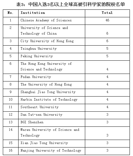 中國(guó)入選3名以上全球高被引科學(xué)家的院校名單