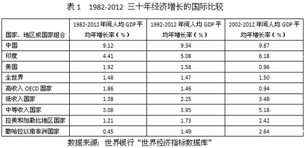 但是,收入低的國家經(jīng)濟增長一定快過收入高的國家嗎?事實并非如此。從表1可以看到,在1982-2012三十年間,低收入發(fā)展中國家人均GDP年均增長率只有1.38%,還低于發(fā)達國家的速度;而中等收入發(fā)展中國家年均增長率也只有3.08%,遠低于中國。