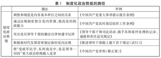 五是將“中國(guó)共產(chǎn)黨的領(lǐng)導(dǎo)是中國(guó)特色社會(huì)主義最本質(zhì)的特征,是中國(guó)特色社會(huì)主義制度的最大優(yōu)勢(shì)。黨政軍民學(xué),東西南北中,黨是領(lǐng)導(dǎo)一切的”這一重大政治原則載入十九大黨章,確保了黨領(lǐng)導(dǎo)國(guó)家的制度化和可持續(xù)性。表1展示了制度化政治勢(shì)能的路徑。