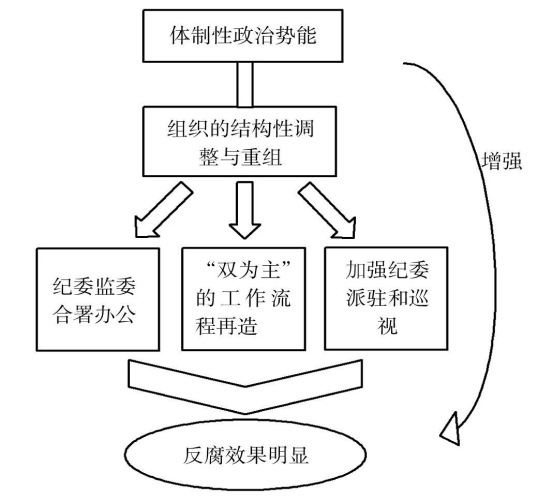 體制性政治勢(shì)能是對(duì)黨的紀(jì)檢機(jī)構(gòu)進(jìn)行結(jié)構(gòu)性調(diào)整與重組以進(jìn)行治國(guó)理政的一種方式。黨的最高紀(jì)檢機(jī)構(gòu)即中共中央紀(jì)律檢查委員會(huì)(簡(jiǎn)稱“中紀(jì)委”),是中國(guó)共產(chǎn)黨的最高紀(jì)律檢查機(jī)關(guān),它不屬于任何政府部門(mén),但服從中共中央委員會(huì)領(lǐng)導(dǎo)。十八大以來(lái),新一屆黨中央對(duì)紀(jì)檢體制機(jī)制進(jìn)行了一系列的改革創(chuàng)新實(shí)踐,極大地增強(qiáng)了體制性的政治勢(shì)能,其做法包括紀(jì)監(jiān)合署辦公、工作流程再造、加強(qiáng)派駐機(jī)構(gòu)和巡視工作等措施(見(jiàn)圖3)。