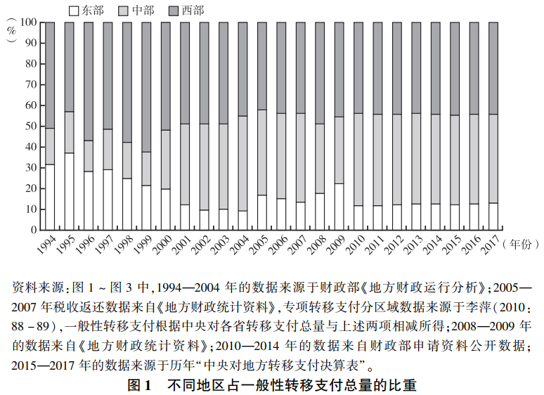 將一般性轉(zhuǎn)移支付和專項轉(zhuǎn)移支付合計,分稅制改革初期,東部地區(qū)占總量的比重達(dá)30%,此后逐年下降,2000年后穩(wěn)定在20%以下。改革初期,西部地區(qū)占總量的比重略高于中部地區(qū),2000年之后,二者占比基本持平,都在40%以上?梢,改革初期,中央財政轉(zhuǎn)移支付分配在一定程度上仍然偏向于東部地區(qū),進(jìn)入21世紀(jì)后才開始大力向中西部地區(qū)傾斜。