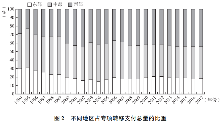 中央財政轉(zhuǎn)移支付主要指向了中西部地區(qū)。分稅制改革初期,東部地區(qū)所獲一般性轉(zhuǎn)移支付占總量的比重高達(dá)30%左右,但很快迅速下降,2000年之后基本在10%左右。西部地區(qū)獲得一般性轉(zhuǎn)移支付的比重在改革初期就達(dá)到50%左右,2000年之后則長期穩(wěn)定在45%左右。中部地區(qū)在改革初期占一般性轉(zhuǎn)移支付的規(guī)模較小,2001年后長期穩(wěn)定在40%左右。顯然,2000年以后,一般性轉(zhuǎn)移支付的85%~90%流向了中西部地區(qū)(見圖1)。分稅制改革初期,東部地區(qū)獲得專項轉(zhuǎn)移支付的比重也接近30%,此后逐年下降,2000年后基本在20%以下。中部地區(qū)占比在改革初期達(dá)到40%以上,并長期穩(wěn)定在這一水平。西部地區(qū)在改革初期占比不足30%,此后逐步上升,2000年后一直在40%左右。因此,2000年之后專項轉(zhuǎn)移支付的80%以上流入了中西部地區(qū)(見圖2)。