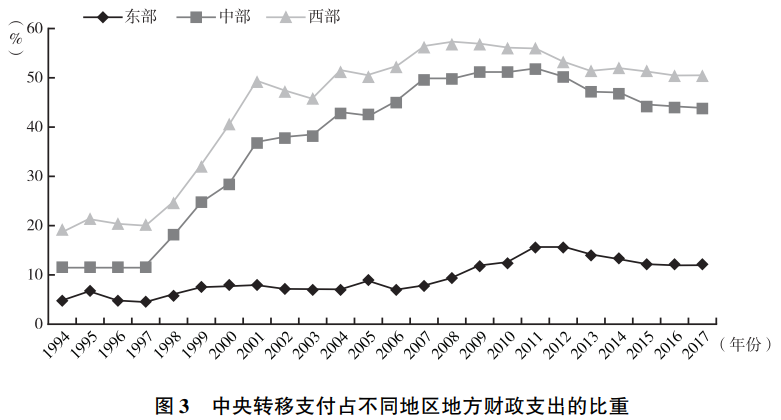 中央財政轉(zhuǎn)移支付對中西部地區(qū)的大規(guī)模傾斜從其占地方財政支出的比重中看得更加清楚。分地區(qū)來看,東部地區(qū)地方財政自給能力很強,地方財政支出的絕大部分來自地方財政收入:1994—2008年,財政轉(zhuǎn)移支付占東部財政支出的比重一直在10%以下,2009年后略有上升,但最高也未超過15%。中西部地區(qū)則相反:1994—1997年,中央財政轉(zhuǎn)移支付占中部財政支出的比重僅10%左右,1998年開始迅速上升,2000年為28%,2011年達(dá)到52%,此后略有降低,但也一直穩(wěn)定在45%左右。1994—1997年,中央轉(zhuǎn)移支付占西部地區(qū)財政支出的比重即達(dá)到20%左右,1998年后快速增長,2000年已達(dá)到41%,此后繼續(xù)上升,2008年達(dá)到57%,2012年后略有下降,但也一直穩(wěn)定在50%以上。顯然,2000年以后,財政轉(zhuǎn)移支付已經(jīng)成了中西部地區(qū)地方支出的主要來源,地方支出中的一半左右長期依賴中央轉(zhuǎn)移支付(見圖3)。