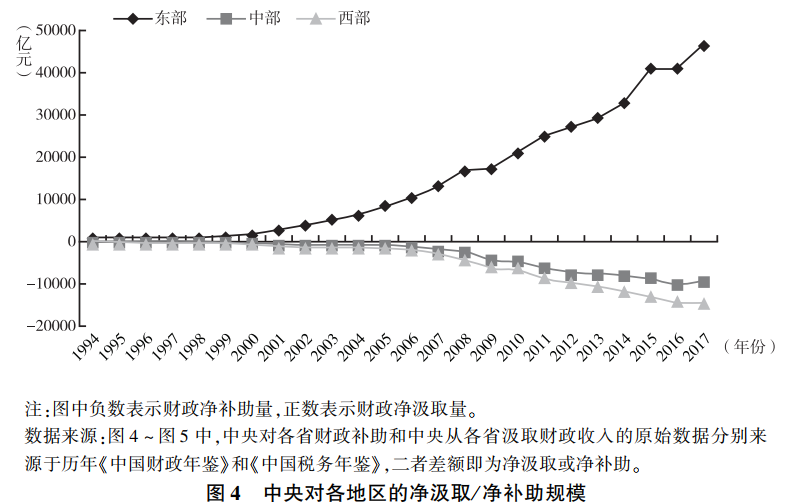 我們可以把中央從一個地區(qū)汲取的財政收入與對該地區(qū)的財政補助之差稱為中央從該地區(qū)的凈汲。ɑ騼粞a助)。東部地區(qū)是創(chuàng)造全國財政收入的主體,中央對中西部地區(qū)的財政補助主要來源于從東部地區(qū)的財政汲取。1994年,中央從東部地區(qū)凈汲取財政收入就達(dá)998億元,此后逐年增長,但2000年之前增速比較緩慢。所得稅分享改革后,中央從東部地區(qū)的凈汲取規(guī)模急速上升,2000年僅1700多億元,2005年就超過8000億元,2010年則達(dá)到2萬億元以上,2017年更是高達(dá)4.6萬億元(見圖4)。