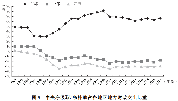 我們可進(jìn)一步分析中央凈汲取或凈補助占各地區(qū)財政支出的相對比重,以深入理解其重要性。分稅制改革初期,中央從東部地區(qū)凈汲取財政資金約占地方財政支出的50%,20世紀(jì)90年代中后期,這一比重下降到30%左右(見圖5)。但進(jìn)入21世紀(jì)后,中央從東部凈汲取的財政資金占地方財政支出的比重又迅速上升,2008年達(dá)到81%。自2010年以來,受經(jīng)濟危機和經(jīng)濟增速放緩的影響,這一比重略有下降,但也長期保持在65%左右。因此,分稅制改革初期,中央從東部地區(qū)凈汲取的財政資金相當(dāng)于東部地區(qū)創(chuàng)造的財政總收入的30%以上,2008年達(dá)到50%左右,2010年后長期保持在40%以上。截至2017年,中央對東部地區(qū)所有省份都是凈汲取關(guān)系。1998年之前,中部地區(qū)也是中央凈汲取地區(qū),但中央凈汲取占地方財政支出比重非常小。1999年開始,中部地區(qū)轉(zhuǎn)變?yōu)樨斦䞍粞a助地區(qū),凈補助占當(dāng)年地方財政支出比重為8.65%,此后穩(wěn)步增長,2001年達(dá)到18.62%,2002—2005年略有回落,但自2006年開始再次快速增長,2009年達(dá)到23.8%,此后長期維持在20%以上。西部地區(qū)自1995年開始就是財政凈補助地區(qū),當(dāng)年凈補助占地方財政支出比重僅0.36%,但此后快速增長,2000年就達(dá)到26.6%,2001年高達(dá)35.66%。2002—2005年略有回落,但此后迅速增長,2009年達(dá)到35.67%的高位。2010年之后,中央凈補助占西部地方財政支出的比重一直在30%以上。截至2017年,中央對中西部所有省份都是凈補助關(guān)系,其中絕大部分省份都在1994—2001年先后成了凈補助省份,河北和山西2009年才徹底轉(zhuǎn)為凈補助。