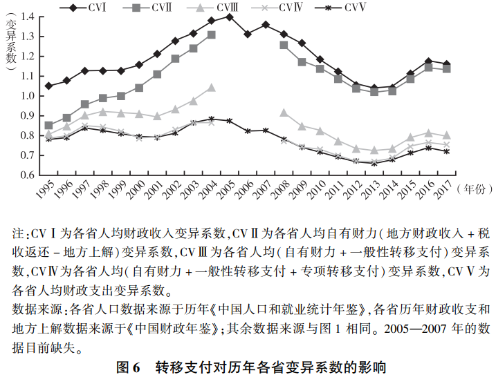 從變異系數(shù)分解結(jié)果來看(見圖6),歷年各省自有財力變異系數(shù)明顯小于財政收入變異系數(shù),2000年前尤為明顯。由于稅收返還是分稅制改革對發(fā)達(dá)地區(qū)的讓步,一定程度上強化了地區(qū)間財力差距,這里的變異系數(shù)縮小主要是由地方上解所產(chǎn)生的均衡地區(qū)間財力差距的功能,其他研究也證實了這一點(賈曉俊、岳希明,2015;王瑞民、陶然,2017)。2000年后,尤其是2005年后,稅收返還和地方上解的相對比重均大為下降,兩條變異系數(shù)曲線間的差距也顯著縮小。加入一般性轉(zhuǎn)移支付后,各年變異系數(shù)均大幅下降。相對而言,2000年之前的降幅更小,這表明一般性轉(zhuǎn)移支付的均衡效應(yīng)較;2000年之后,變異系數(shù)下降幅度顯著增大,一般性轉(zhuǎn)移支付在均衡區(qū)域間財力差距方面的作用顯著增大。進(jìn)一步加入專項轉(zhuǎn)移支付后,各年變異系數(shù)繼續(xù)下降,但下降幅度較加入一般性轉(zhuǎn)移支付后要小很多,這表明專項轉(zhuǎn)移支付雖然對地區(qū)間財力差距具有一定均衡效應(yīng),但比一般性轉(zhuǎn)移支付的效應(yīng)明顯要小。加入專項轉(zhuǎn)移支付后的變異系數(shù)曲線和各省人均財政支出變異系數(shù)曲線已高度重合。