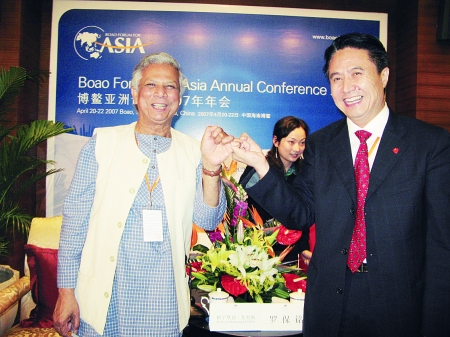 2007年4月,時(shí)值博鰲亞洲論壇年會召開,尤努斯應(yīng)邀出席論壇。當(dāng)時(shí)任海南省省長羅保銘得知尤努斯成功用小額貸款幫助幾百萬貧困農(nóng)民脫貧致富的故事后,主動要求與尤努斯進(jìn)行會面。